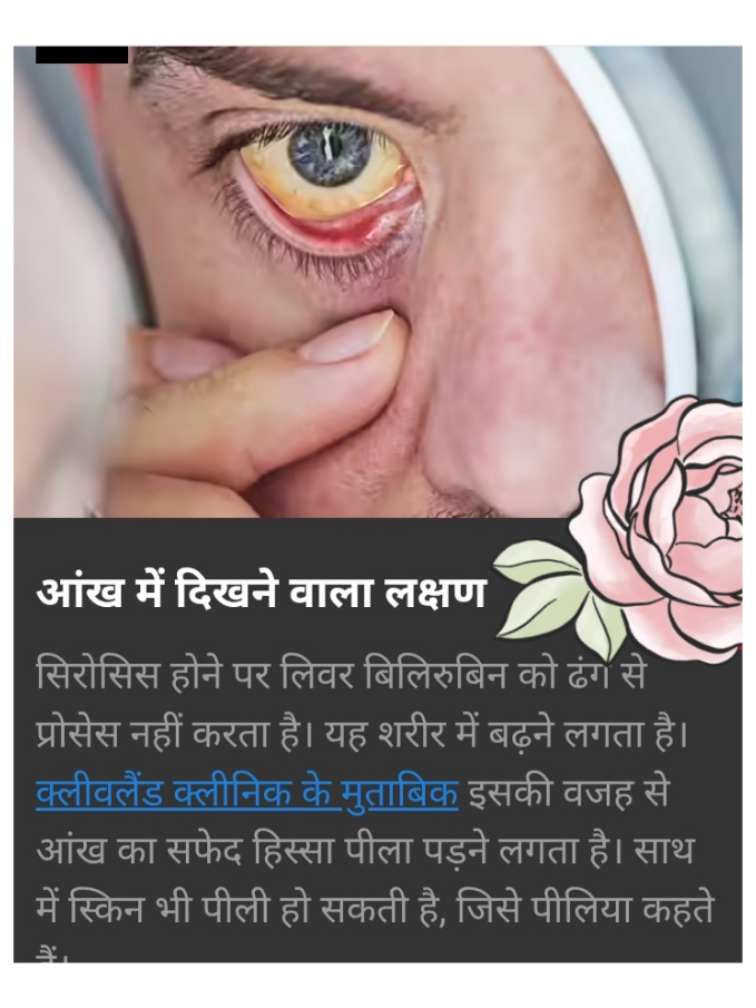 लिवर सिरोसिस में, लिवर ठीक से काम नहीं कर पाता है, जिससे बिलिरुबिन नामक पदार्थ का संचय होता है। यह बिलिरुबिन आंखों के सफेद भाग (स्क्लेरा) और त्वचा को पीला कर देता है.