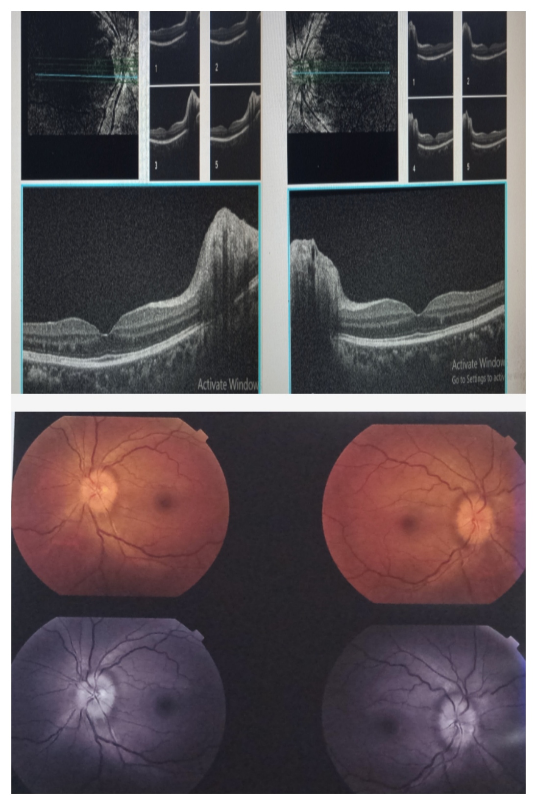 जांच करने पर दोनो आंखों की नजर 6/9 आ रही थी लेकिन चश्मे का कोई नंबर नही आ रहा था, आंख का आंतरिक दबाव भी सामान्य रहा ,विस्तृत जांच करने पर दोनो आंखों की नस Optic nerve पर सूजन पाई गई